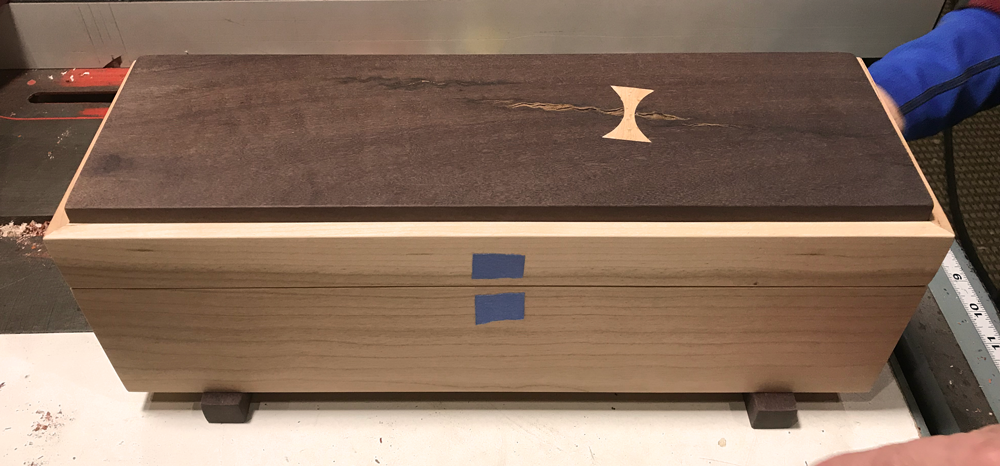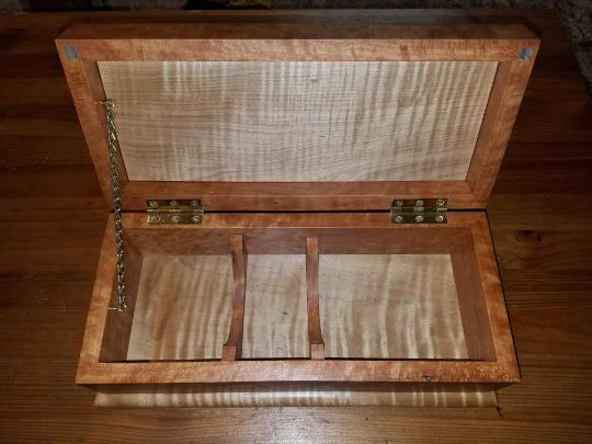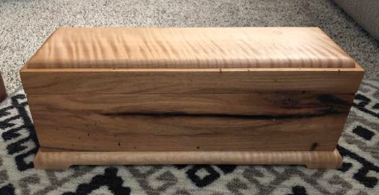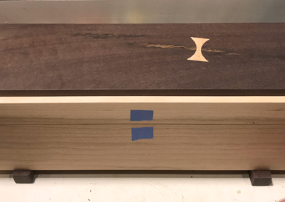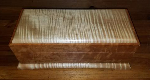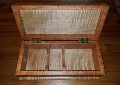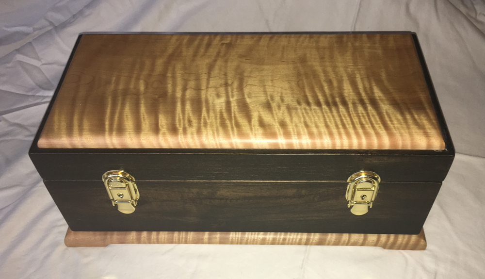 Quilted Maple and stained Butternut Wedding Box, closed. The couple used clasps from the musician groom’s guitar case to customize their box.