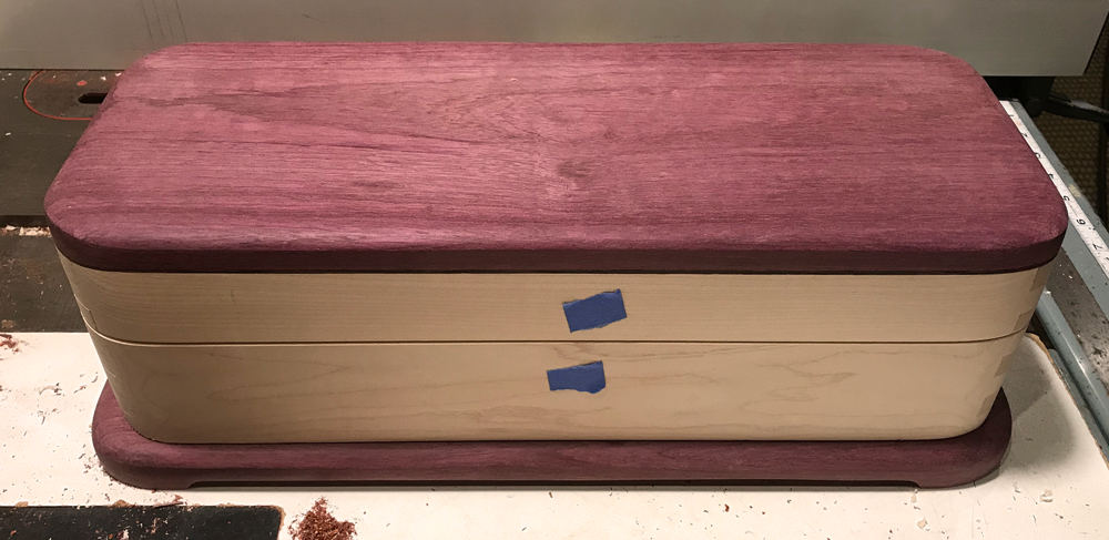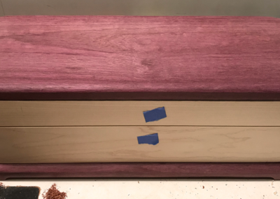 Custom [Wine] Box ($285, #BX551); Purpleheart lid with Wenge strip at closure. Maple body with Purpleheart footer. Box features curved, finger-jointed corners. Inside box dimensions with lid closed; 4 7/8″ wide x 14 3/4″ long x 3 7/8″ deep.