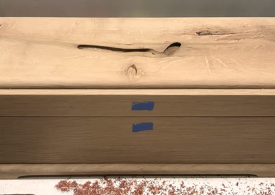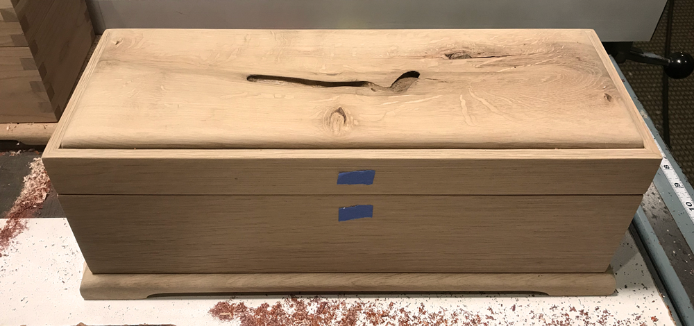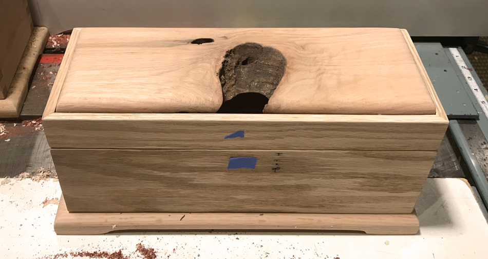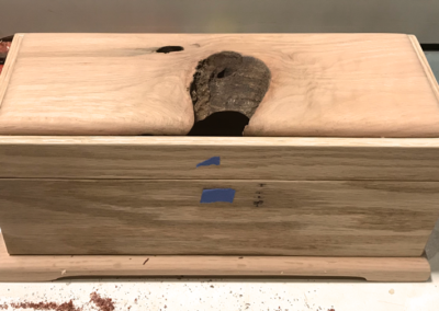 Custom [Wine] Box ($285, #BX552); White Oak pillow top lid with wormy detail, Body constructed of White Oak with mitered corners and a White Oak footer. Inside box dimensions with lid closed; 4 1/2″ wide x 14 1/4″ long x 4 1/2″ deep.